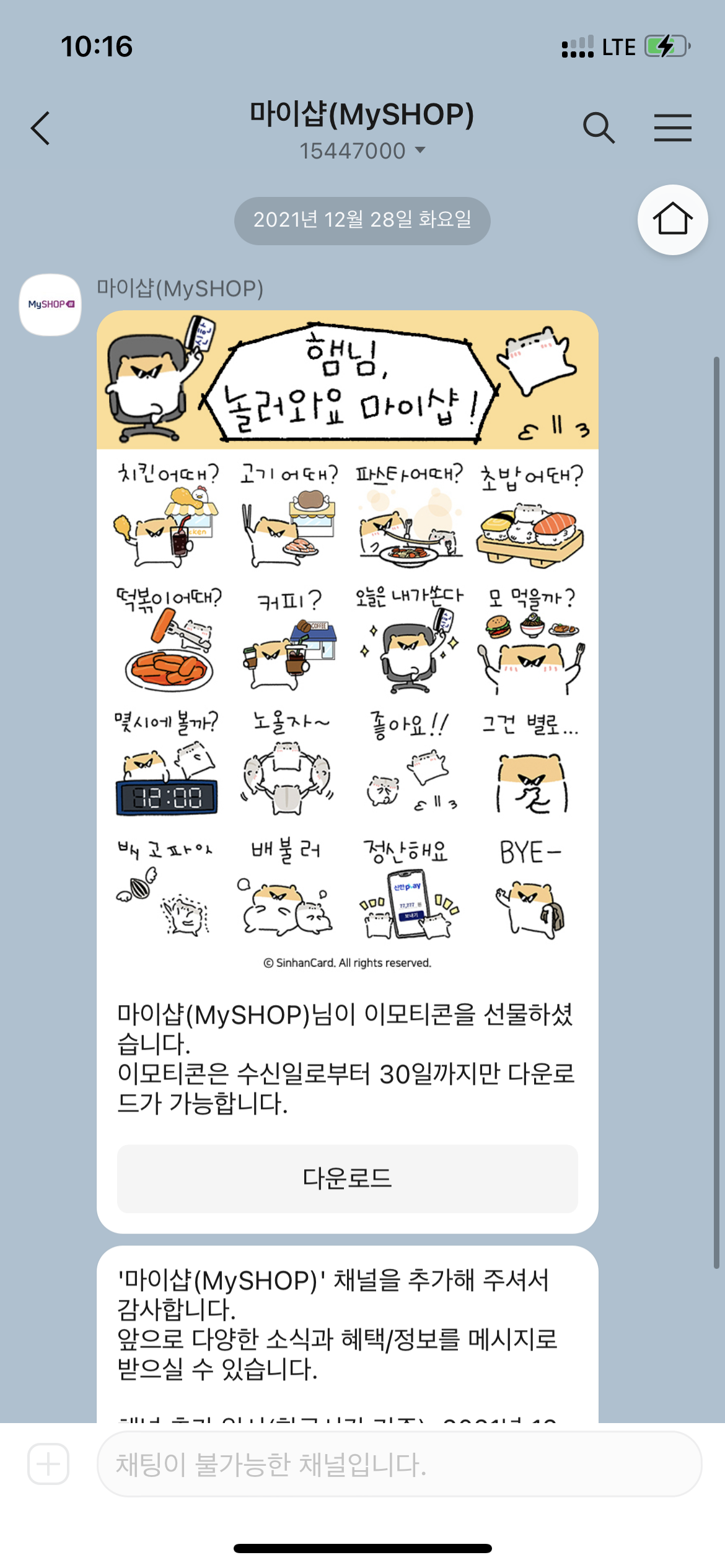 이모티콘 메시지의 다운로드 버튼을 누릅니다