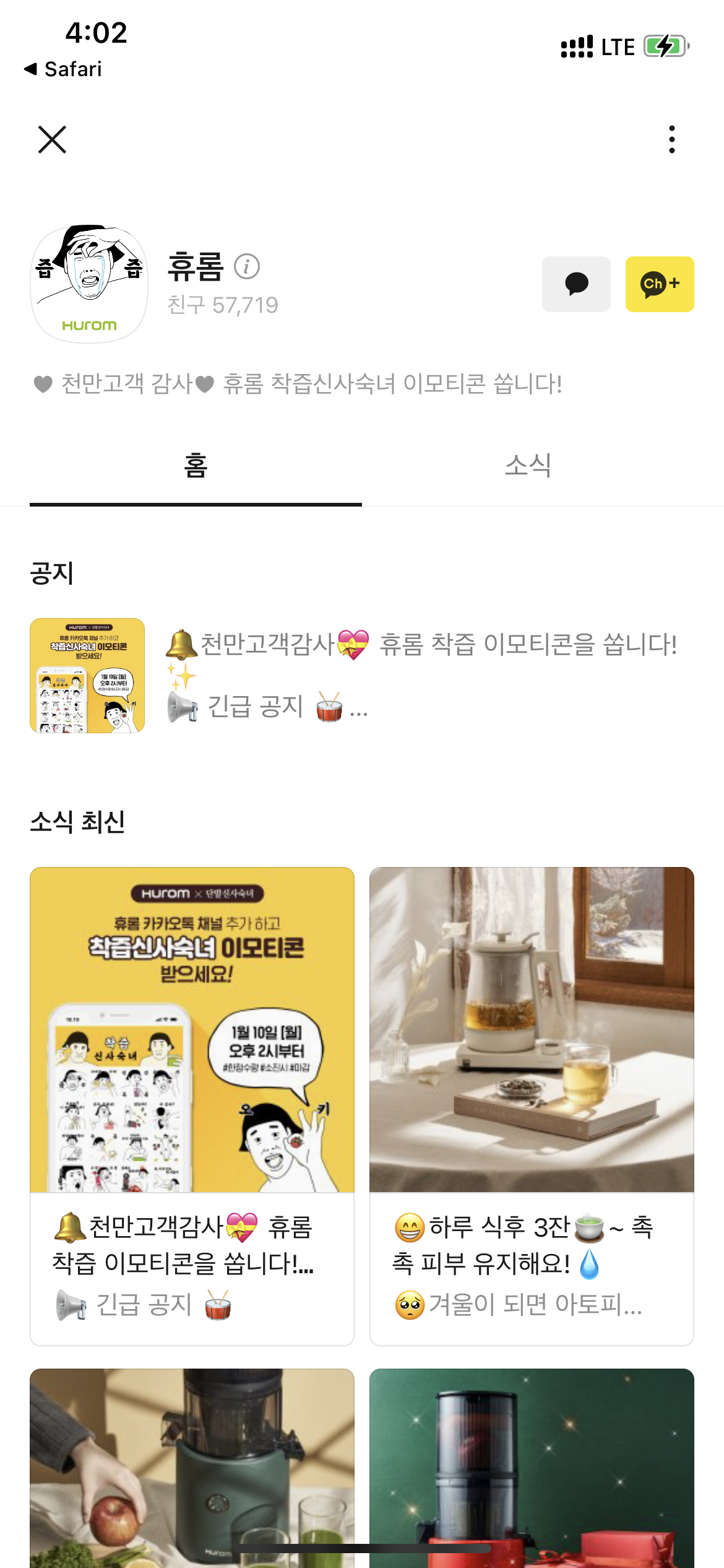 2) 휴롬 카카오톡 채널을 친구추가 합니다