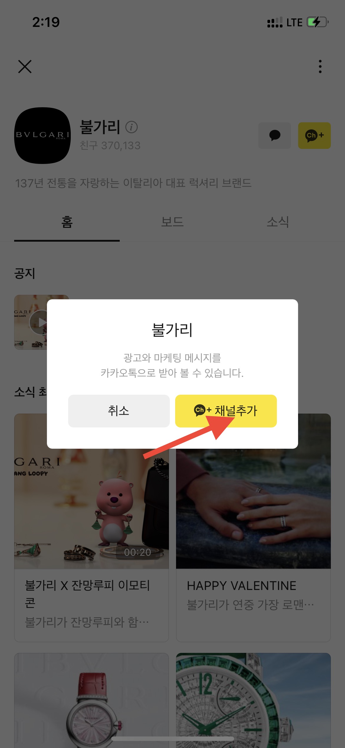 2) 불가리 채널추가 버튼을 누릅니다