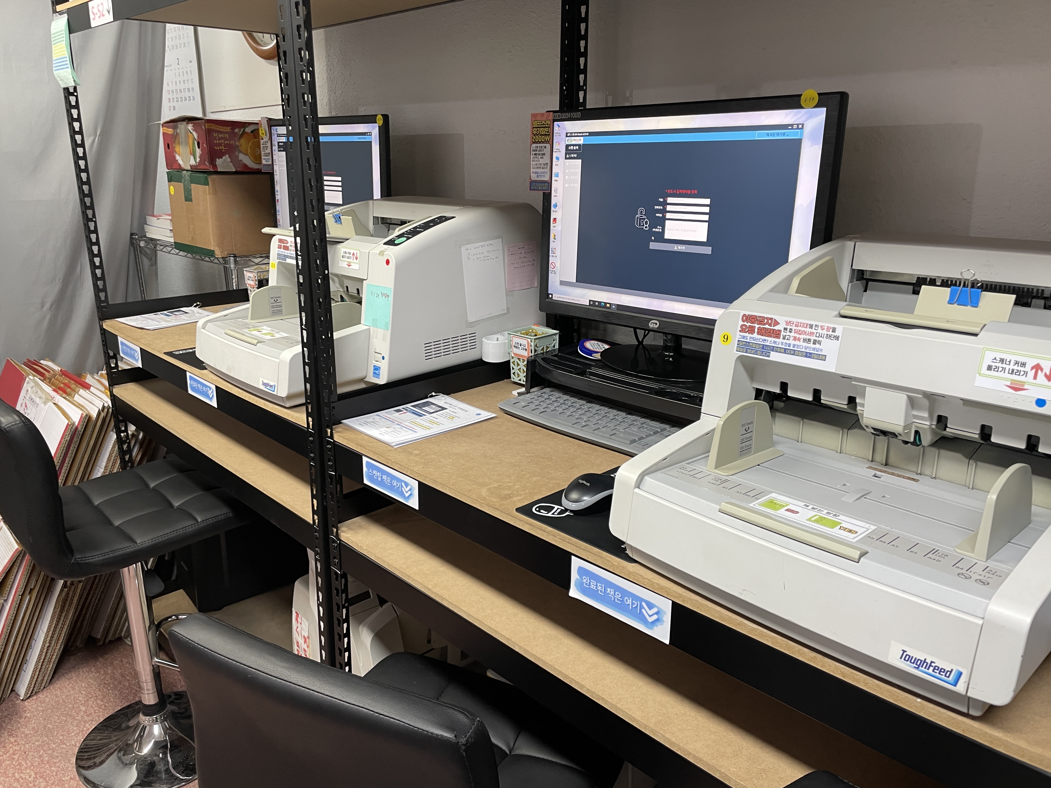 사무실에 들어서자 많은 피씨와 스캐너가 있었어요